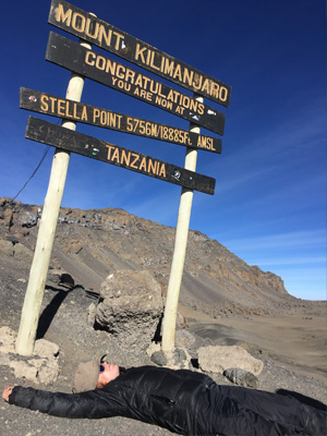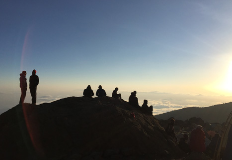 A few hours later the sun rose. I could see the top – Stella Point, at 5756m. In my euphoria I broke free from Whitey and the others and began to scramble towards the Stella Point sign. Then I realised, what on earth was I doing? I was wearing 5 layers including a woollen hat and scarf, I was dehydrated and exhausted, had no sunscreen on whilst the dawn sunlight was burning down on me. I collapsed into the side of the path and told Whitey that I thought I was going to die of heat exhaustion. He simply said ‘if you are going to die, you will not reach the summit’. That snapped me back to reality.